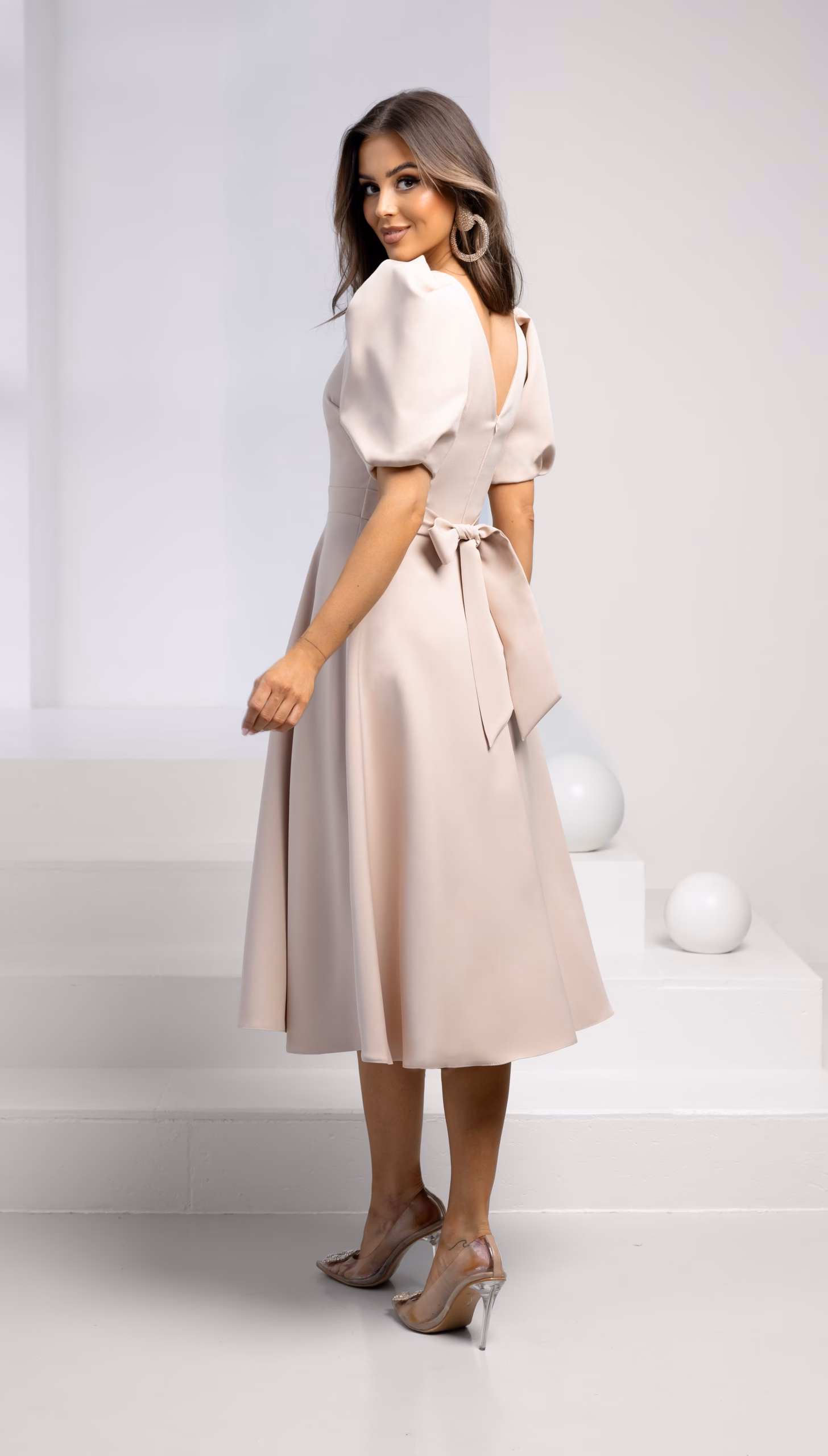Kaunis helebeeži tooni midipikkuses pidulik kleit, millel on kergelt puhvis varrukad, rõhutatud pihaosa ja rikkalik seelikuosa.