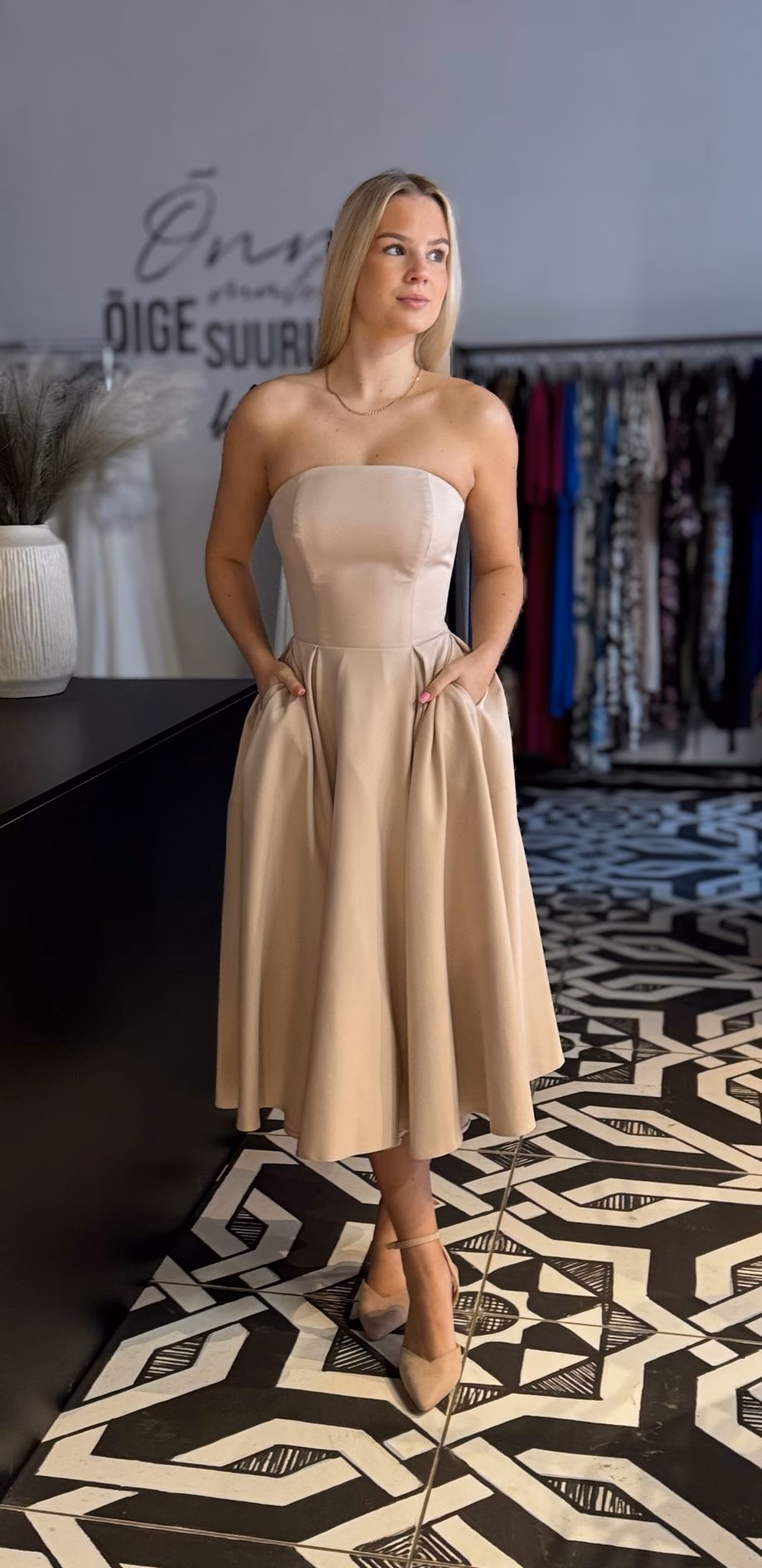 Rikkalik, volüümikas seelikuosa langeb kaunilt ja loob liikudes efektse ning luksusliku mulje. Praktilised küljetaskud muudavad kleidi kandmise eriti mugavaks – ideaalne detail, mis ühendab ilu ja funktsionaalsuse. Seljal asuv peidetud tõmblukk tagab puhta ja viimistletud välimuse.