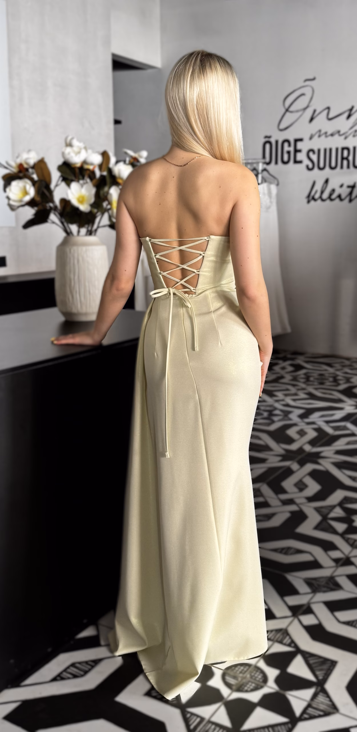 Elegantne maksikleit on luksuslikust, kerge säraga helekollasest kangast. Drapeeritud esiosa ja avatud paelkorsetiga seljaga. Kleidil on lõhik, mis jääb elegantselt slepi varju. Kaasas eemaldatavad õlapaelad. Sobib ideaalselt lõpetamiseks, ballile ja pidulikele üritustele, tuues esile naiseliku silueti ja luksusliku stiili.
