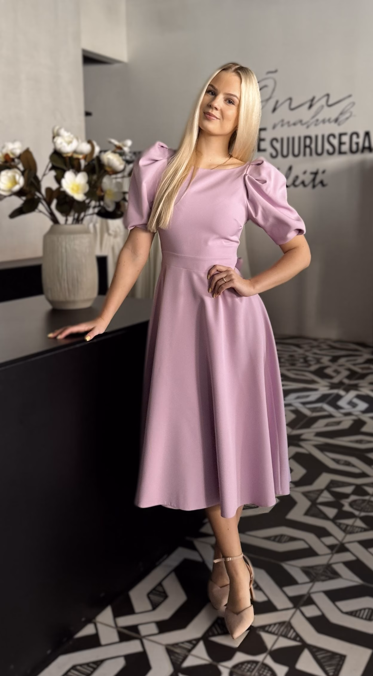 Kaunis tuhmroosat tooni midipikkuses pidulik kleit, millel on  kergelt puhvis varrukad, rõhutatud pihaosa ja rikkalik seelikuosa.