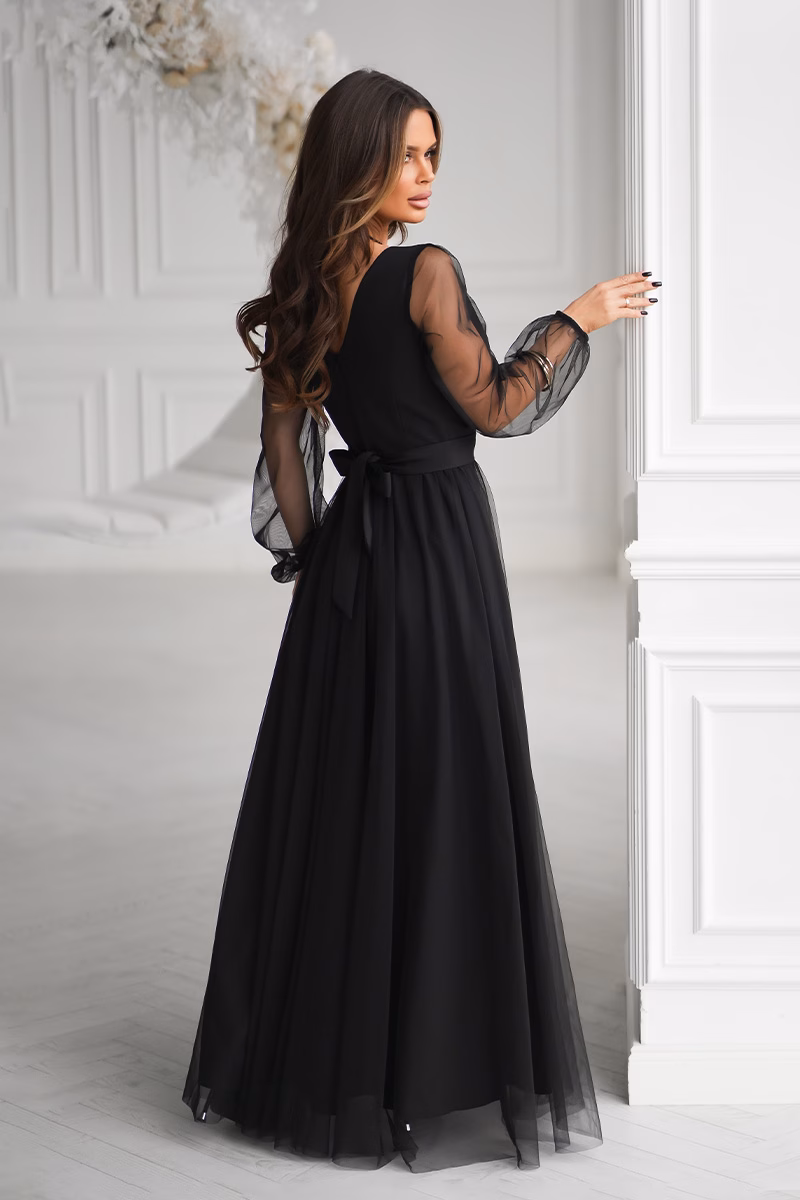 Must pidulik maksikleit tüllvarrukate ja hõlmikkaelusega. Hõlmikkaelus toob esile naiselikkuse, tüllist seelikuosa lisab õhulisust ja külgmine lõhik loob elegantse liikumise. Kleit kinnitub seljal peidetud tõmblukuga, kaasas seotav pihavöö.