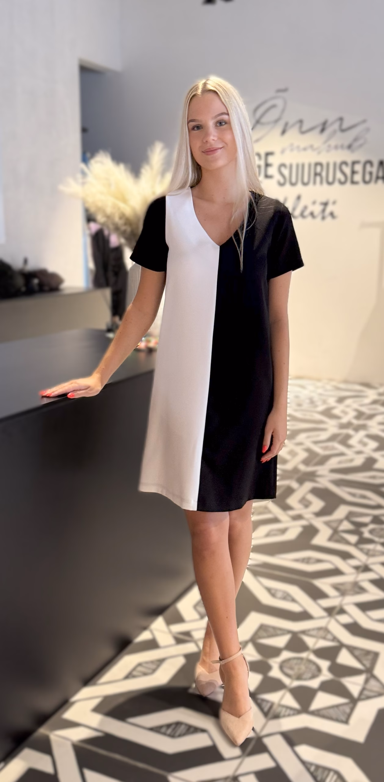 Must/valge sirge lõikega lühikeste varrukatega mugav kleit. Kanna vööga või ilma.