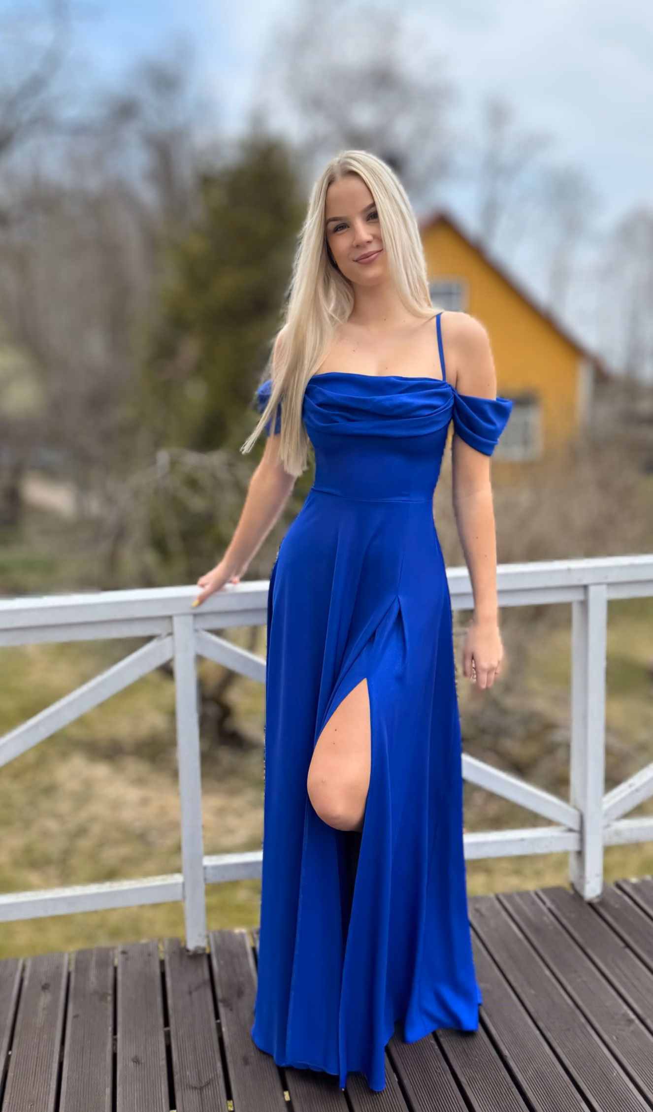 Kaunis säravsinine maksikleit, millele lisavad erilisust kroogitud rinnaosa ja langenud varrukad. Kleit kinnitub seljal peidetud tõmblukuga ja kleidil on lõhik. Pidulikkust lisab kergelt sädelev kangas. Sädelus ei pudene.