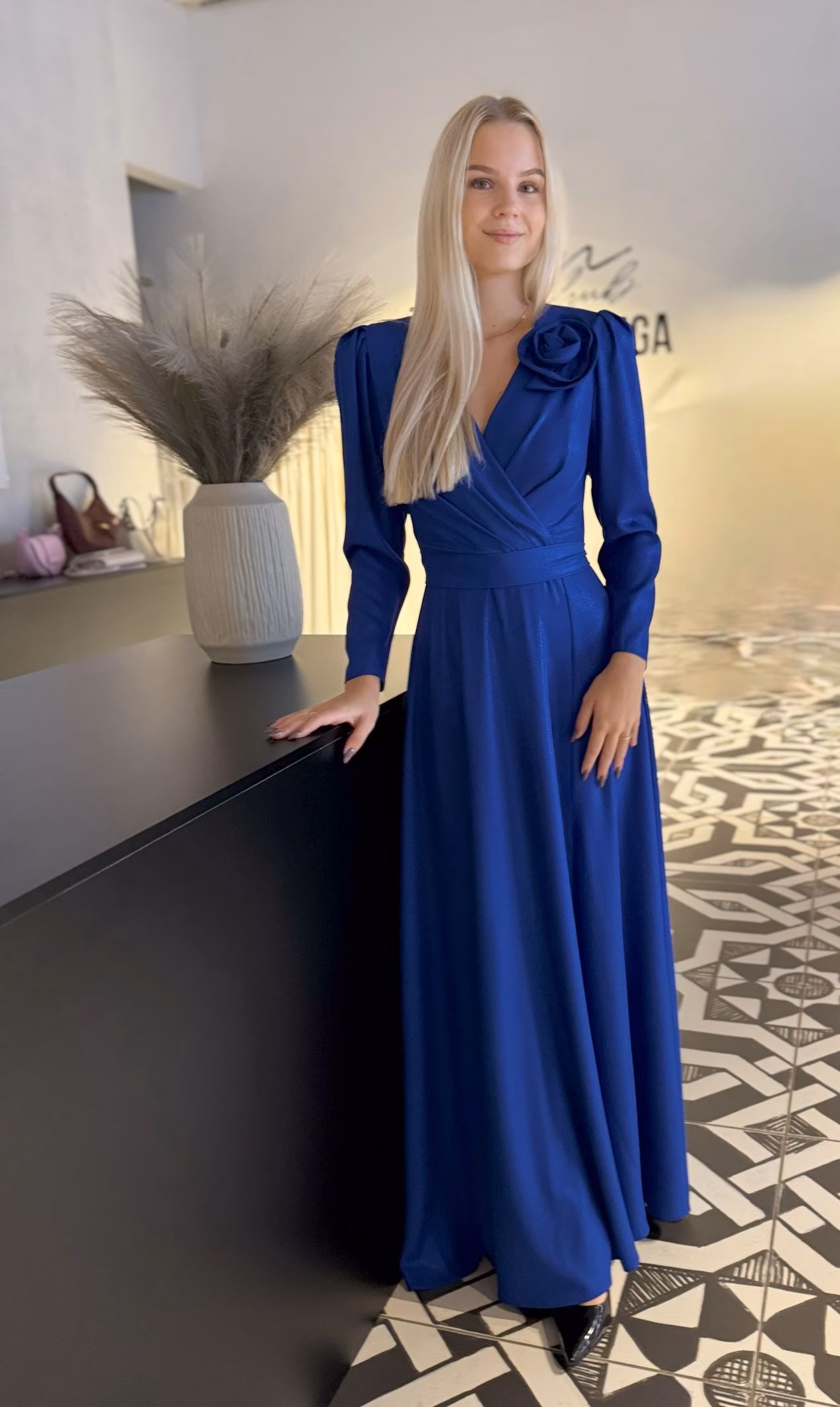 Särav maksipikkuses õhtukleit naiseliku hõlmikkaeluse, rinnakaunistuse ja elegantse lõhikuga. Kerge sädelusega kangas ja peidetud tõmblukk loovad täiusliku piduliku välimuse.